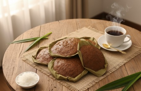 Dari luar, kue bulat pipih berwarna cokelat muda dan beralaskan daun pisang ini mungkin tampak sederhana. Namun, begitu dicicip, rasa manis, asam, dan legitnya berpadu sempurna dengan aroma fermentasi khas. Apalagi jika disantap bersama taburan kelapa parut dan siraman areh atau santan kental, sensasinya bikin ingin nambah lagi.